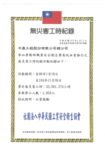 - 2016/4CTCI Headquarters Honored with “Cumulative Record without Accident Proof with a total of 33.89 million hours” by Occupational Safety and Health Administration, Ministry of Labor